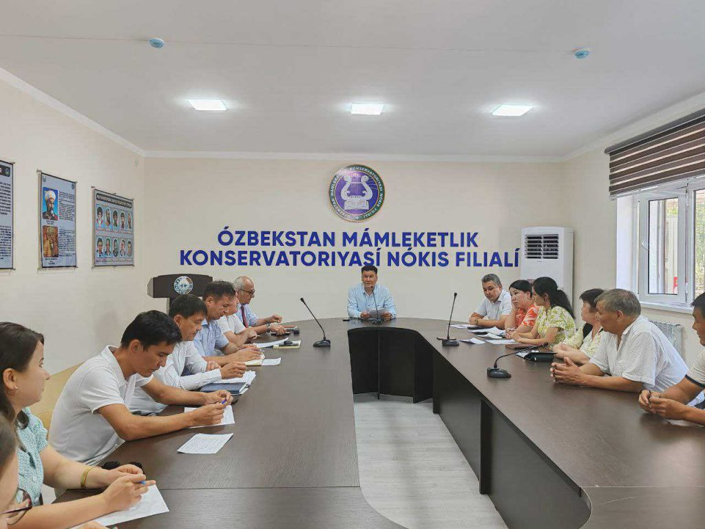 Usı jıldıń 28-avgust sánesinde Ózbekstan mámleketlik Konservatoriyası Nókis filialında Keńes májilisi bolıp ótti. Keńes májilisin filialımız direktorı, Keńes baslıǵı R.Allanbaev ashıp berdi hám basqarıp bardı. Keńes májilisinde tómendegi tiykarǵı máleleler qaralıp ótildi. 1. 2023/2024 oqıw jılı ushın Filial Keńesi quramın dúziw hám tastıyıqlaw haqqında Keńes baslıǵı R.Allanbaev shıǵıp sóyledi; 2. 2023/2024 oqıw jılına Qabıllaw juwmaǵı boyınsha maǵlıwmat Qabıllaw komissiyası juwaplı xatkeri I.Baltashev tárepinen aytıp ótildi. 3. Filialda jaslar menen islesiw sistemasın jáne de jetilistiriw, mádeniy, ruwxıy-aǵartıwshılıq jumıslardı jańa basqıshqa alıp shıǵıw hám belgilengen wazıypalardı tolıq orınlaw barısı boyınsha Direktordıń jaslar menen islesiw, ruwxıy hám aǵartıwshılıq isleri boyınsha birinshi orınbasarı P.Mamutov bayanat berdi. 4. Oqıw procesi barısı, jańa oqıw jılına tayarlıq, dekanat hám kafedranıń oqıw-normativ hújjetlerin tastıyıqlaw haqqında oqıw isleri boyınsha direktor orınbasarı T.Utepova maǵlıwmat berdi.
