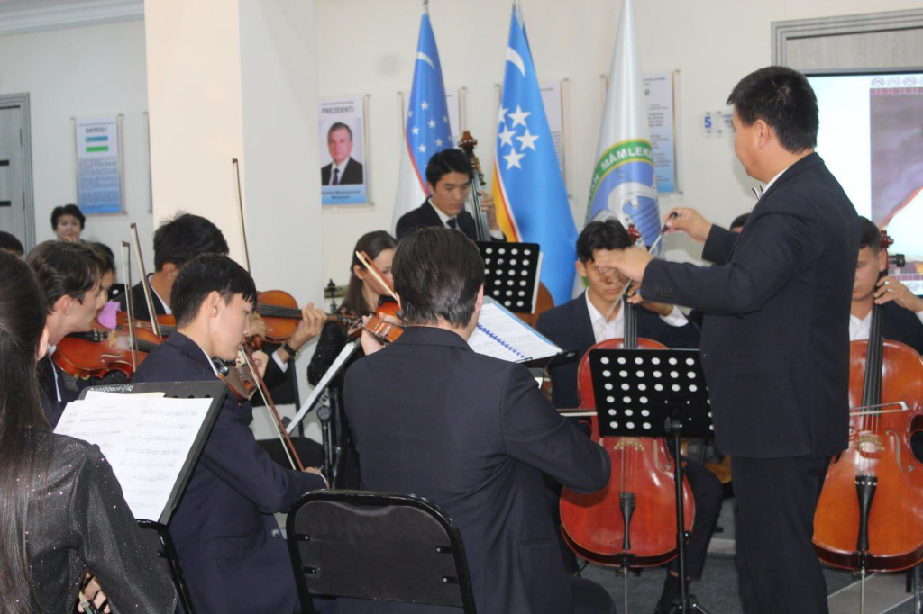Ilaj oqıtıwshı hám dirijyor P. Tnıbaev basshılıǵındaǵı simfoniyalıq orkestriniń A. Babajanyan «Noktyurn» muzıkasın atqarıw menen baslandı.