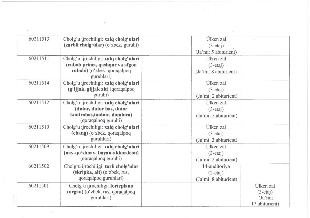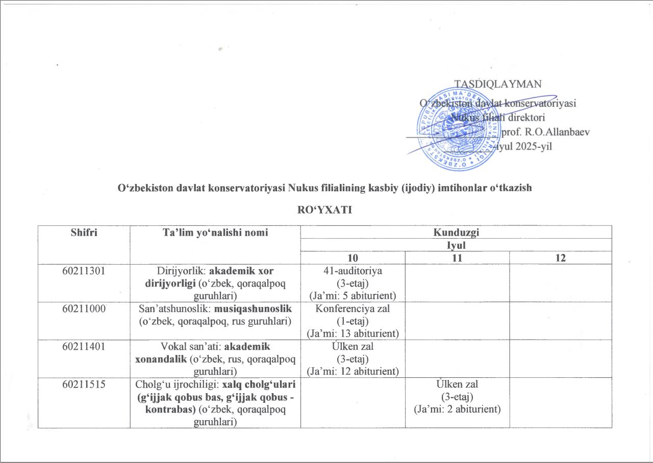 Dóretiwshilik imtixanlardı ótkeriw kestesi ÓZBEKSTAN MÁMLEKETLIK KONSERVATORIYASÍ NÓKIS FILIALÍ 2025-2026 OQÍW JÍLÍ QABÍLLAWÍNDA KÚNDIZGI TÁLIM BAǴDARÍ USHÍN KÁSIPLIK (DÓRETIWSHILIK) IMTIXANLAR ÓTKERIW KESTESI