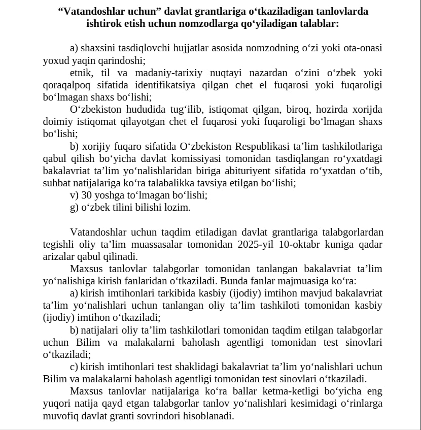 Распоряжением Президента Республики Узбекистан от 18 июля 2025 года No Р-43 «Об утверждении параметров государственного заказа приема на учебу в государственные высшие образовательные организации» выделено 30 государственных грантов для молодых соотечественников, проживающих за рубежом, изъявивших желание обучаться по направлениям узбекского языка и литературы, истории, культуры, искусства и ремесел.